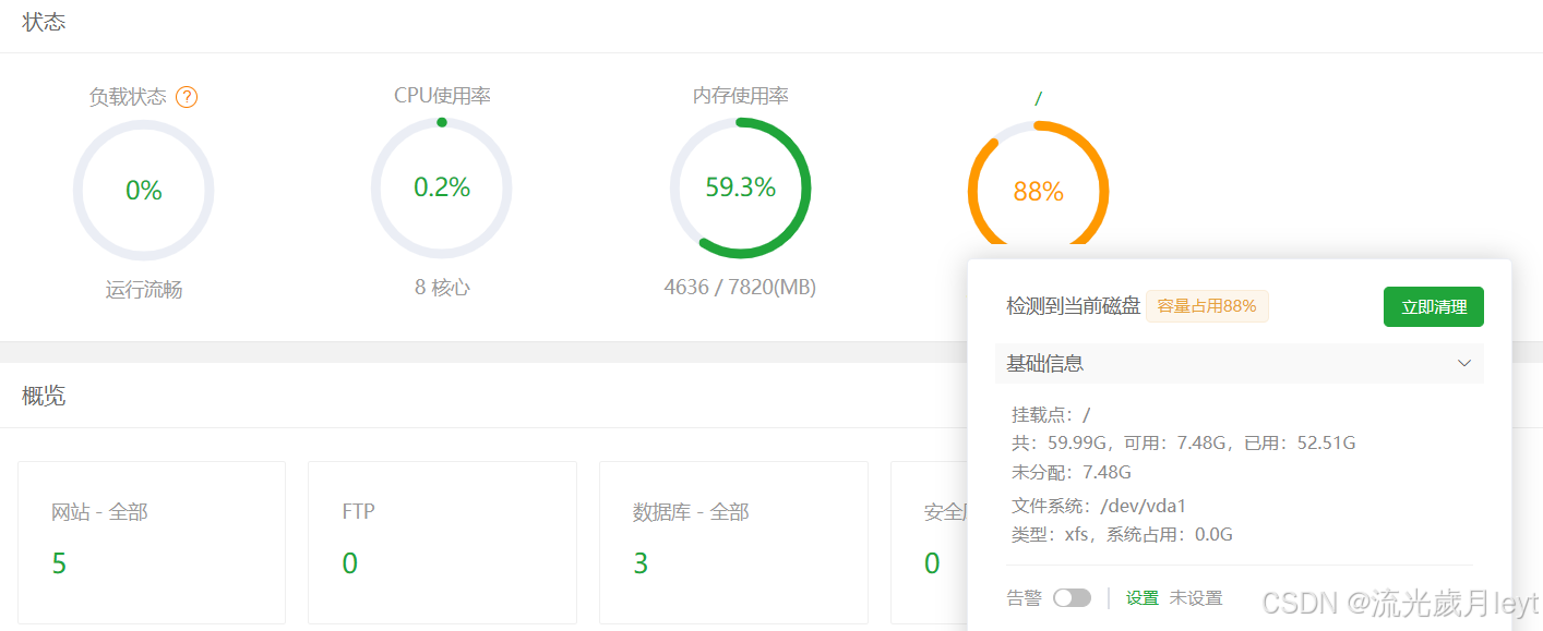 在寶塔面板首頁,通常會有一個“磁盤使用情況”的概覽,這里可以直觀地看到各個分區(qū)的使用情況。如果發(fā)現(xiàn)某個分區(qū)接近滿容量,那么清理工作就尤為必要了。